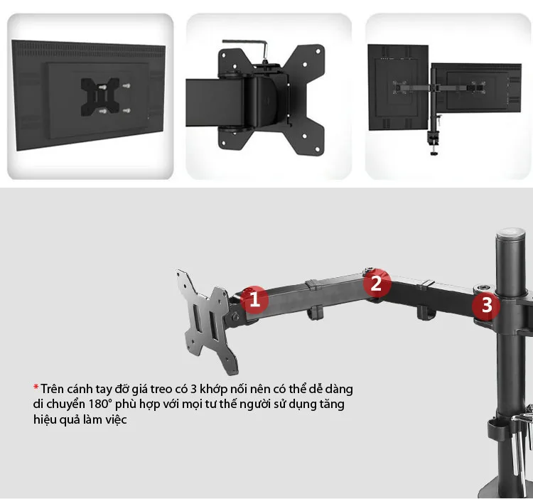 – Tính năng linh hoạt, nâng lên – hạ xuống, sang trái – sang phải, xoay màn hình 360 độ