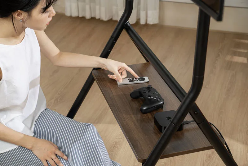 Sản phẩm tích hợp kệ đỡ bằng gỗ tối màu có thể chịu tải lên đến 10 kg, bạn có thể đặt các thiết bị giải trí như đầu phát, tay cầm chơi game, hoặc đồ trang trí nhỏ gọn tiện lợi.