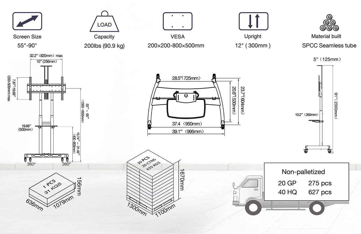 Kích thước tivi hỗ trợ: 55 inch – 90 inch