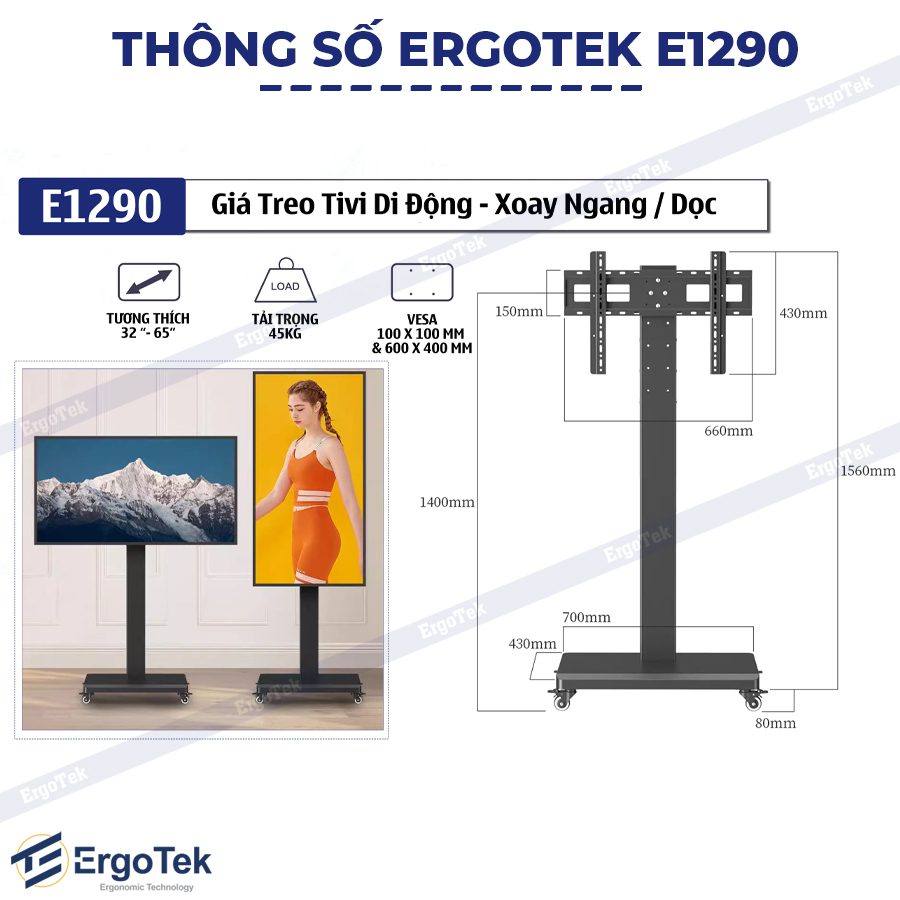 Bạn cần một chiếc giá treo tivi không chỉ di chuyển được mà còn có thể xoay dọc màn hình để livestream hoặc trình chiếu nội dung điện thoại? Ergotek E1290 xoay 90 độ chính là giải pháp đột phá dành cho các dòng tivi từ 32 đến 65 inch, mang lại trải nghiệm sử dụng hoàn toàn mới lạ.