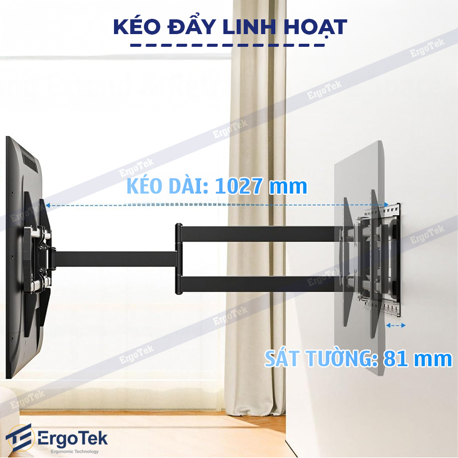 Cánh tay vươn kỷ lục 1 mét: Giúp Tivi từ 50 đến 85 inch có thể xoay vuông góc 90 độ, giải quyết mọi góc lắp đặt khó như hốc tường hay cột nhà.