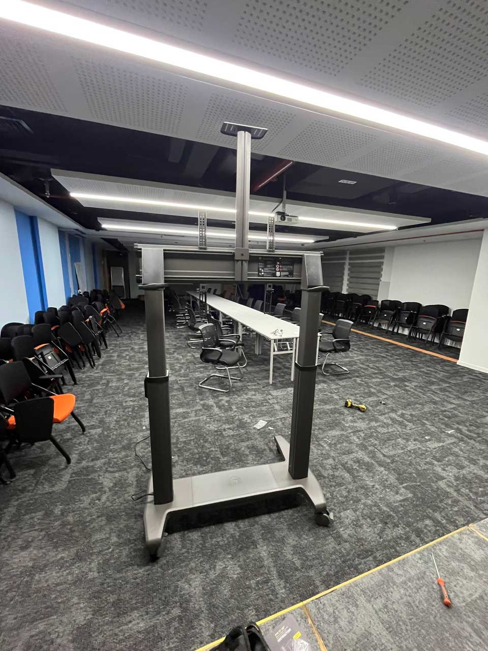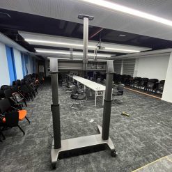 Sản phẩm tích hợp đầy đủ khay để laptop và khay treo camera phía trên, hỗ trợ hoàn hảo cho các buổi họp trực tuyến hoặc thuyết trình quy mô lớn. Mọi dây cáp điện và tín hiệu đều được đi âm bên trong thân cột, giữ cho không gian luôn gọn gàng, thẩm mỹ và đạt chuẩn chuyên nghiệp cao nhất.